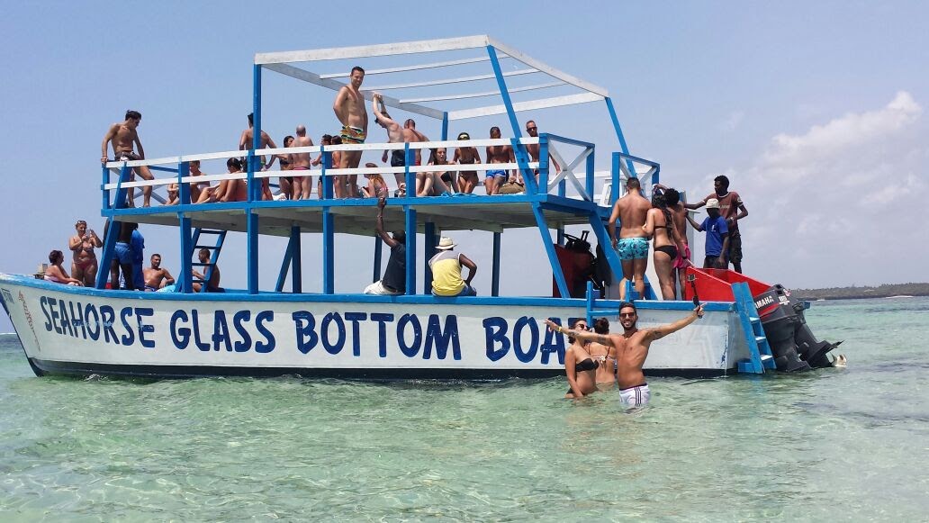 Barca con il fondo di vetro, equipaggiata di maschere, pinne e salvagenti.